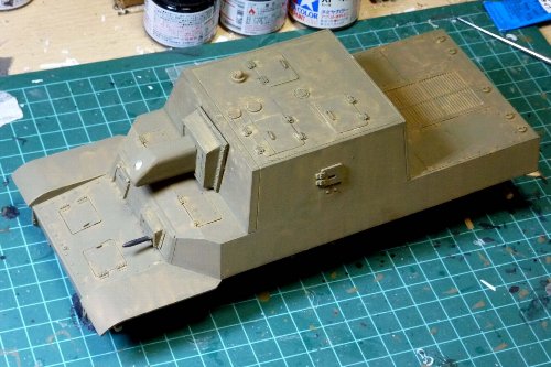 車体上部が凡そ出来たのでカーキ色を薄く一回目塗装。