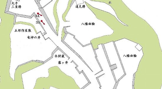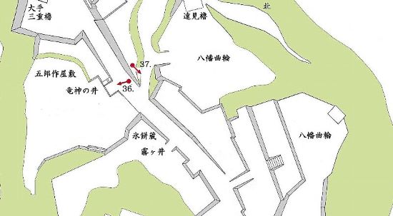 36. 八幡曲輪からの五郎作屋敷虎口跡と竜神の井