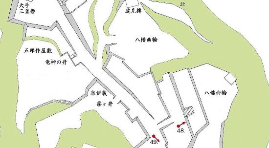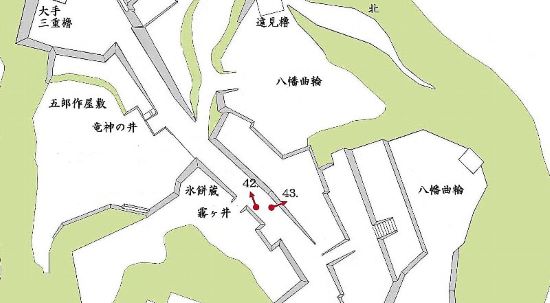 44-1. 八幡曲輪(南区画)の西面石垣と氷餅蔵石垣・霧ヶ井(井戸)