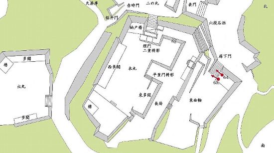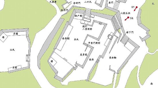57. 東曲輪二重櫓台と廊下門跡石段・本丸北面六段石垣