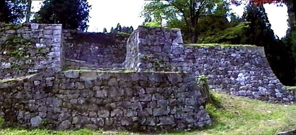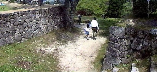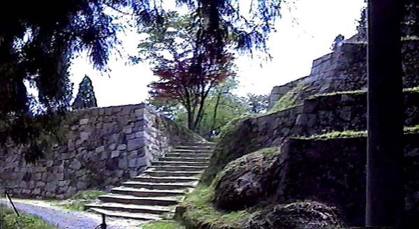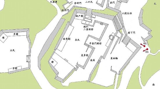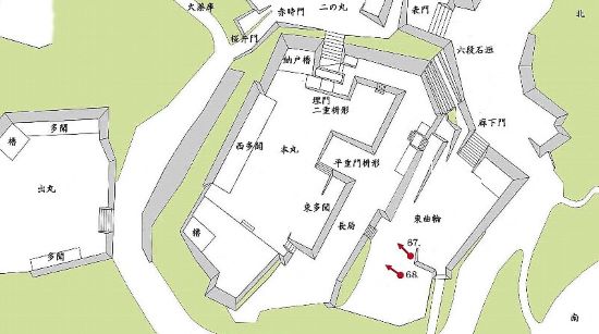 56. 二の丸菱櫓台からの東曲輪廊下門と本丸六段石垣