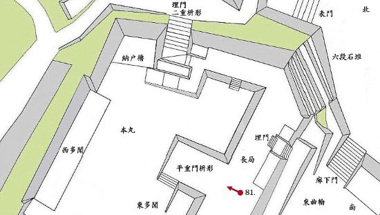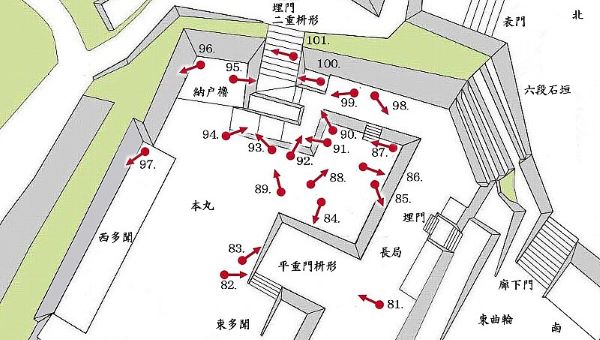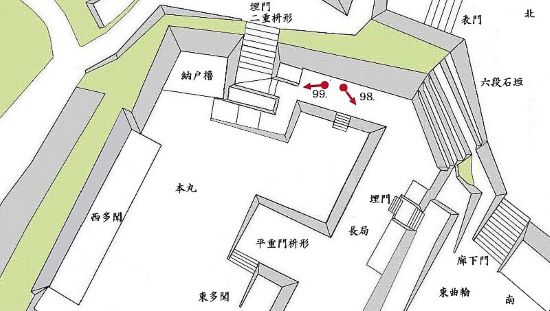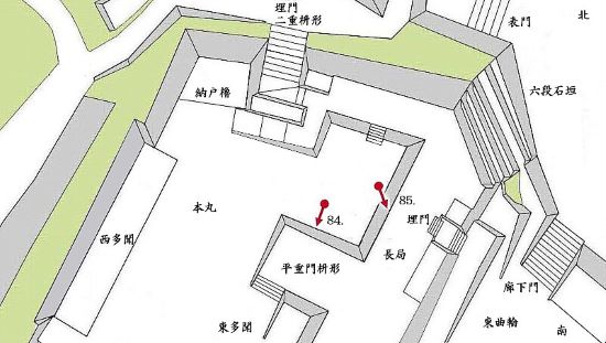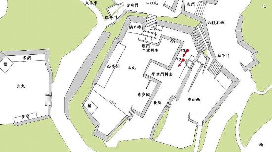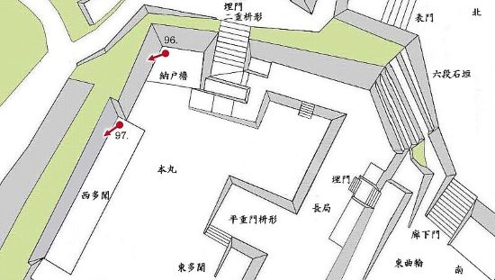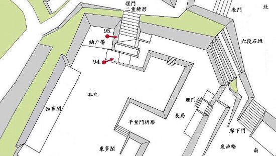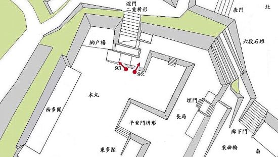 94. 本丸下長局北部納戸櫓脇からの埋門二重枡形石垣