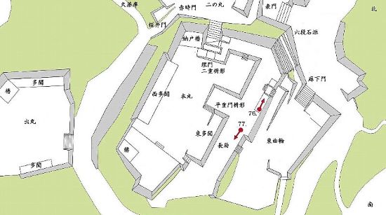 95-1. 本丸下長局北部納戸櫓からの埋門二重枡形石垣