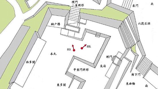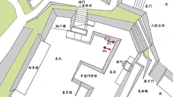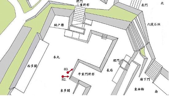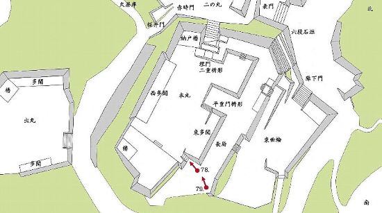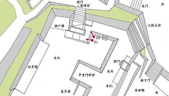 90-2. 本丸からの納戸櫓台と埋門二重枡形石垣