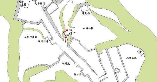 31. 左に五郎作屋敷跡の東北角石垣と大手枡形櫓門跡