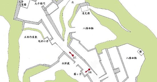 37. 氷餅蔵東北角と八幡曲輪西北角からの大手門方面の俯瞰