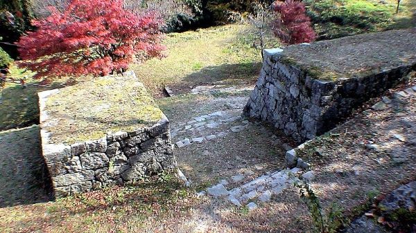左の石垣最上部も欠損していたがこちらも補修されていた。
