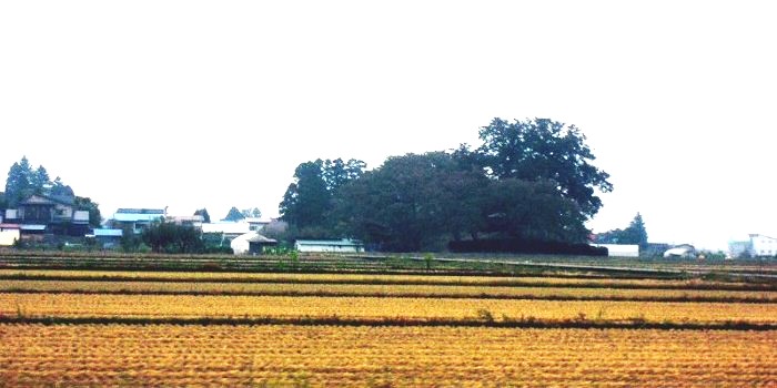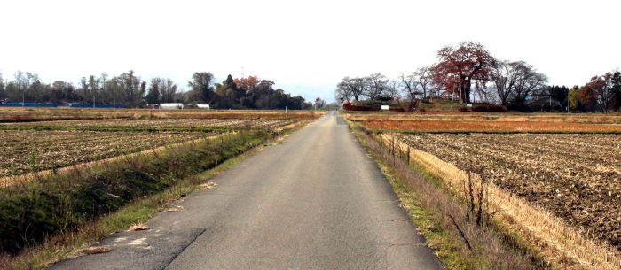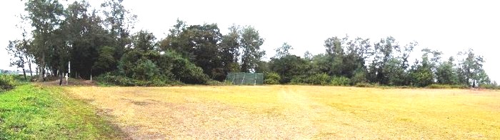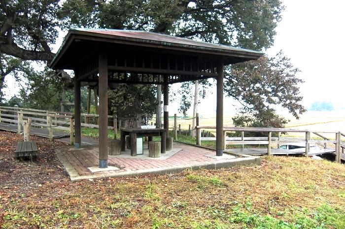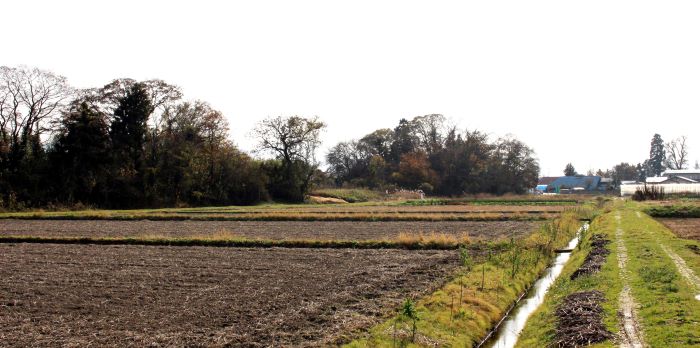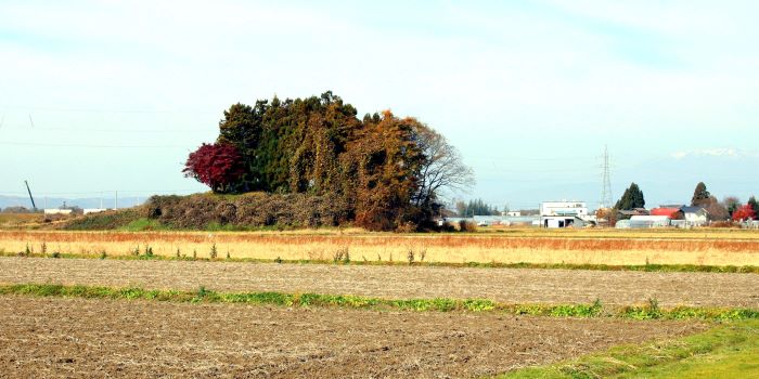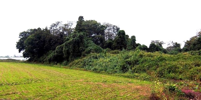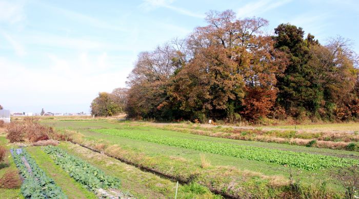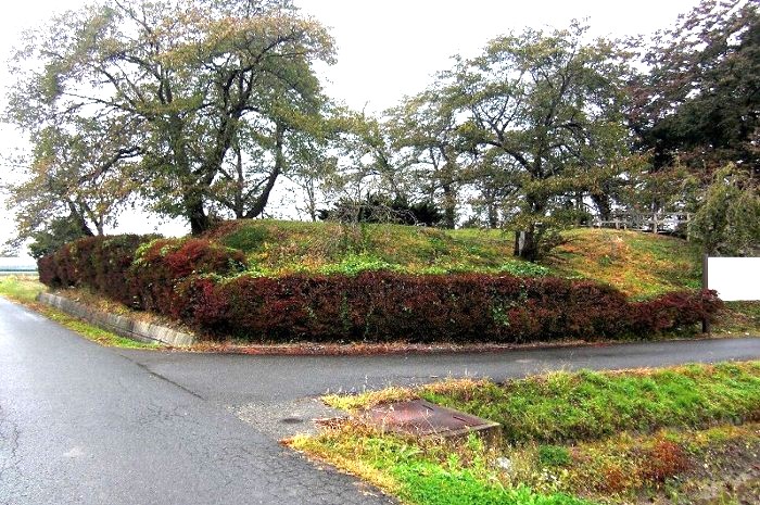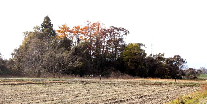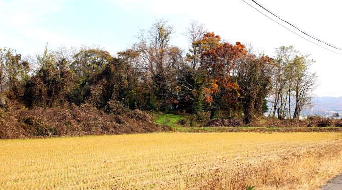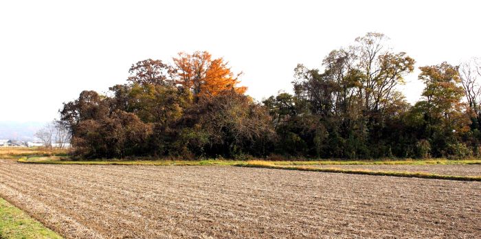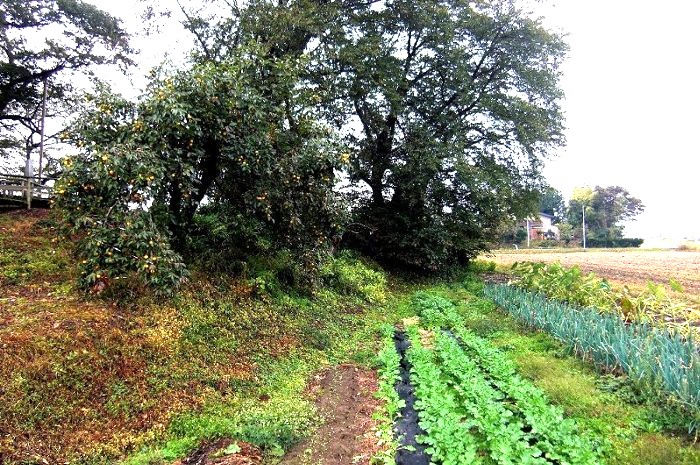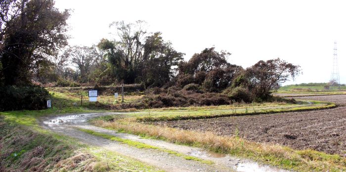 本丸(左)とニの丸東北角土塁(高瀬の大けやき) (2016年)