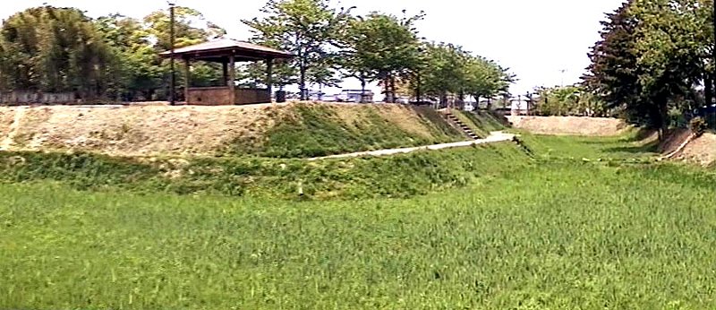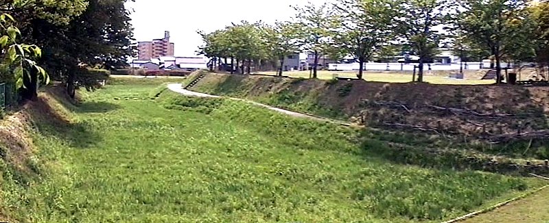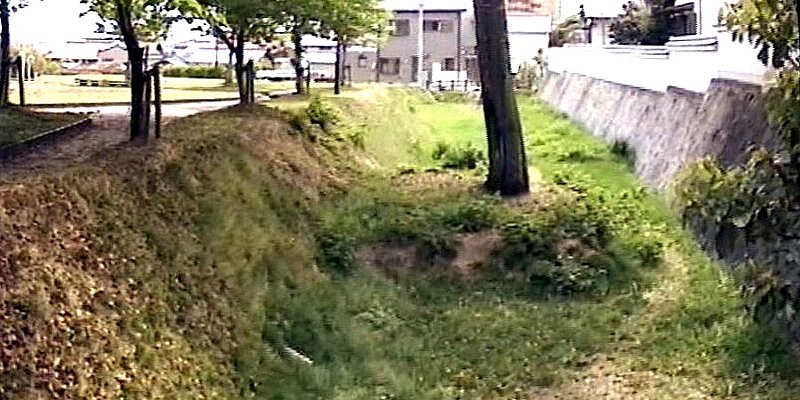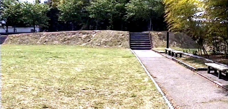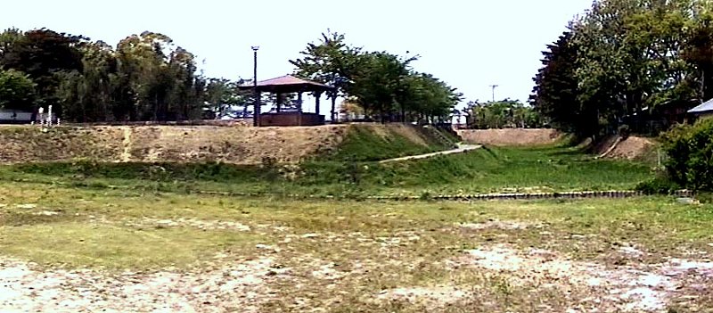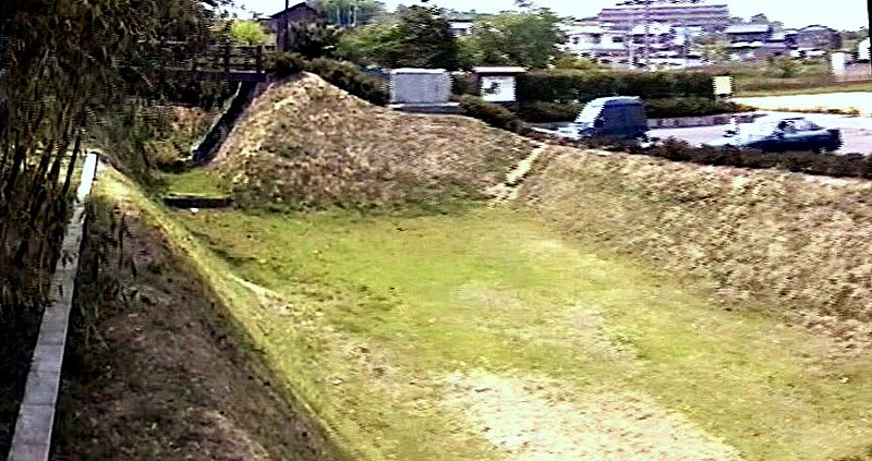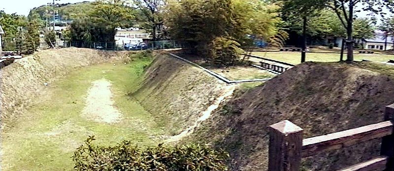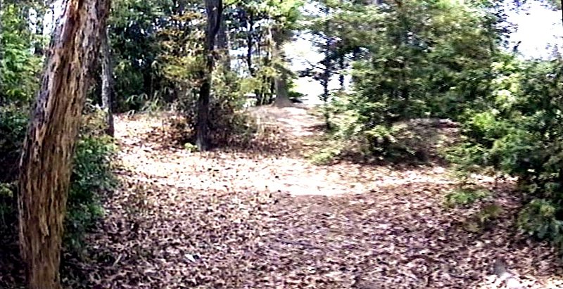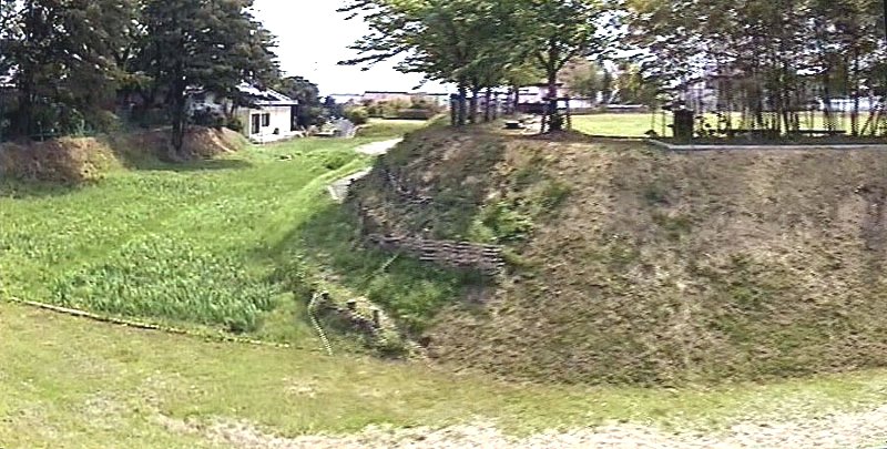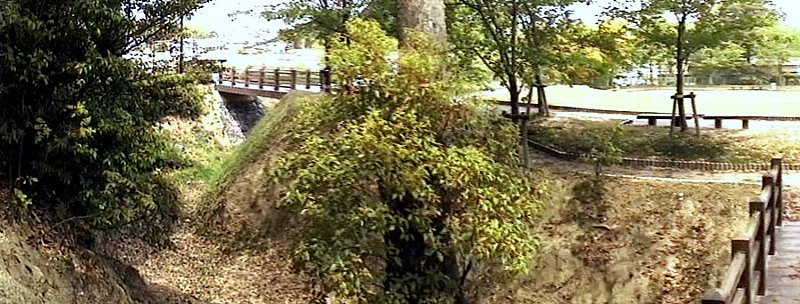 20. 本丸大手口土橋からの南面土塁と空堀右奥に二の丸