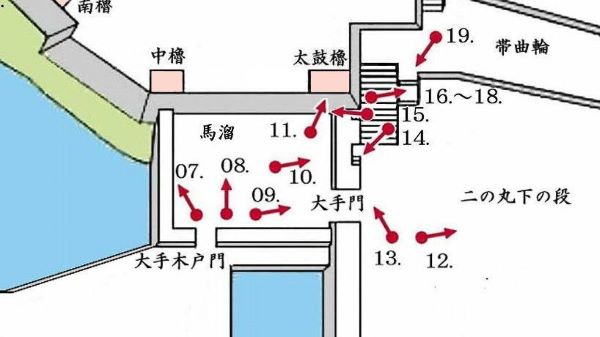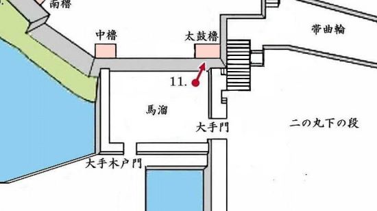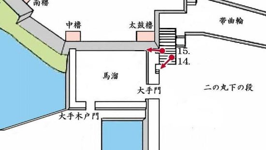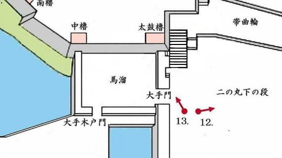 10. 大手馬溜内からの二の丸上の段 太鼓櫓と二の丸下の段大手門跡