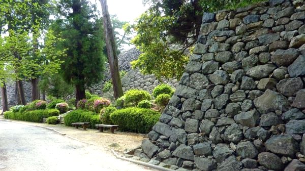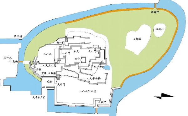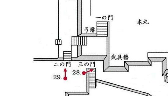 28. 二の丸上の段 三の門跡からの本丸武具櫓台と天守閣