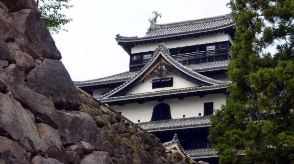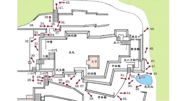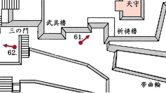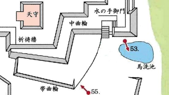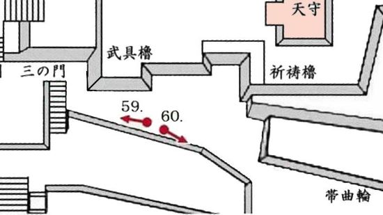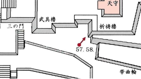 58. 二の丸帯曲輪からの本丸祈祷櫓台と天守閣