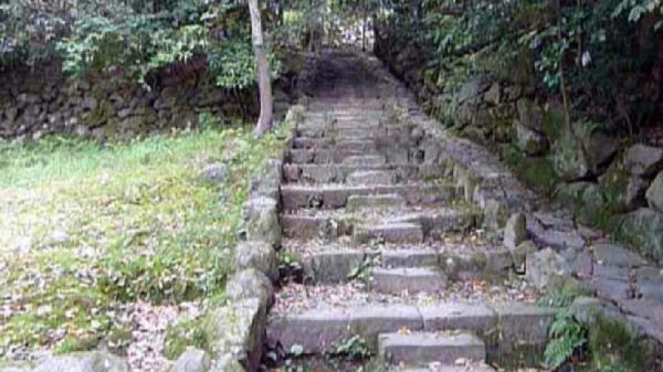 42. 本丸西面帯曲輪から椿谷への石段 (動画から)