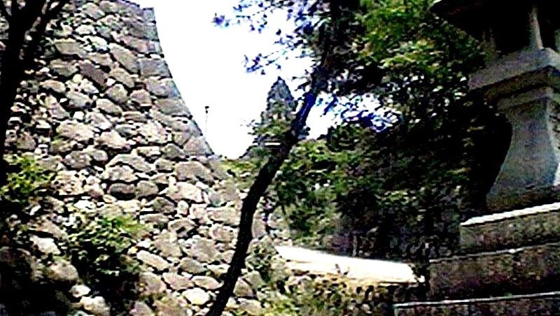 28. 裏一の門跡内から隠居丸北面突出部石垣と本丸下段 太鼓櫓台(二重)