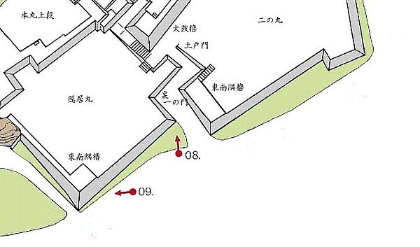 08 . 裏一の門跡からの隠居丸東北角石垣と東面石垣