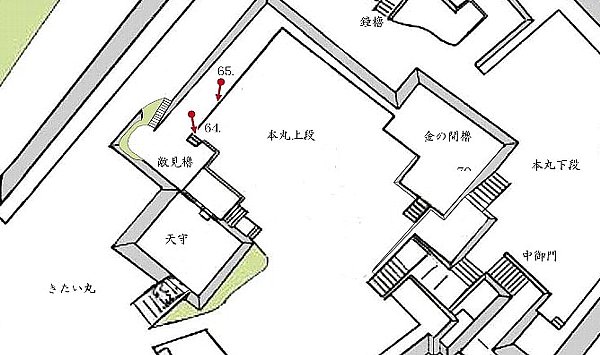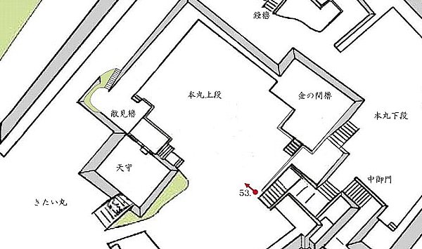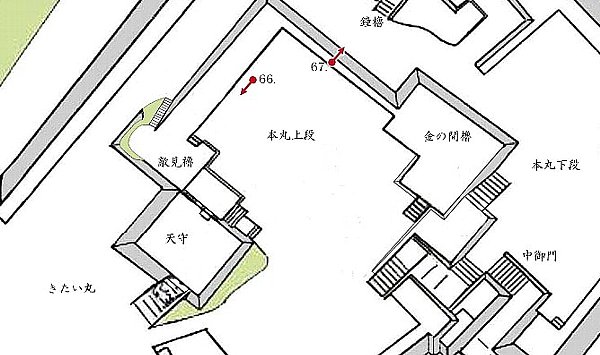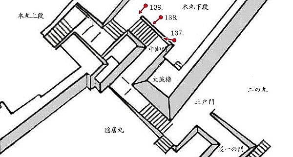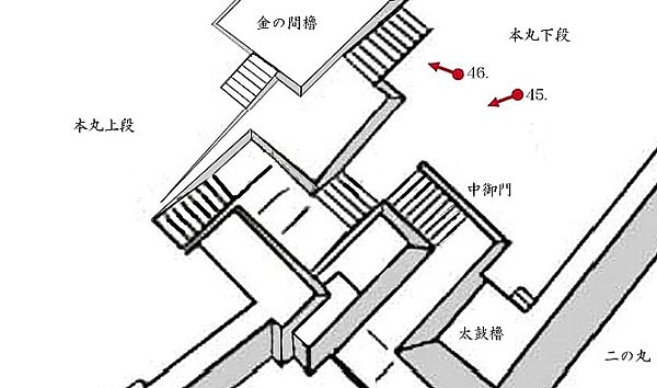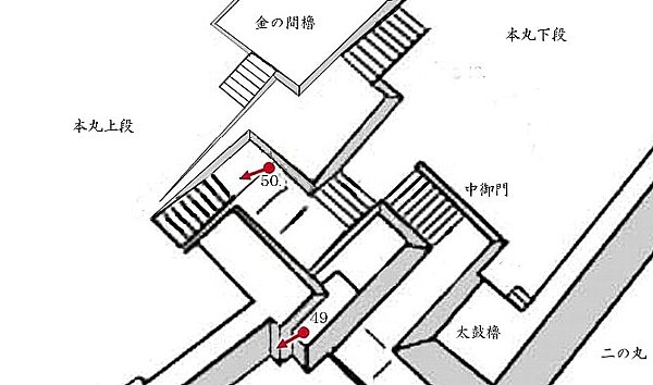 70-1. 金の間櫓台(二重)からの中御門跡と本丸上段虎口