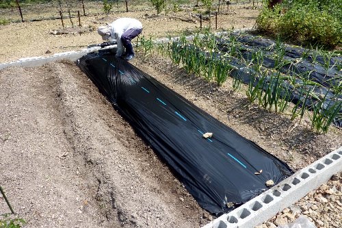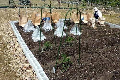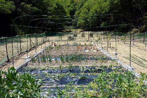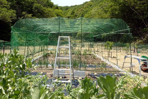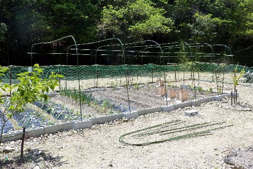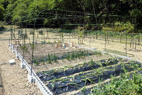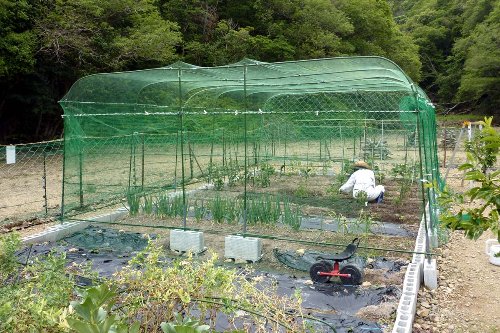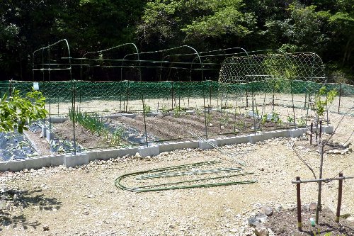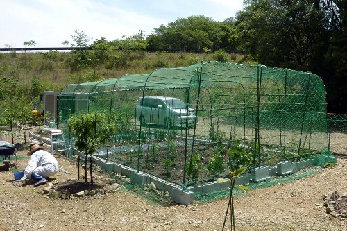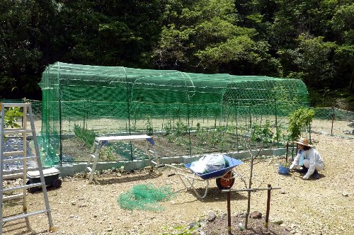 網掛け用骨組みの一部設置を開始。 キュウリ、ゴーヤの網を骨組みに沿わせ取付け。