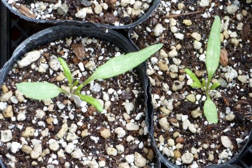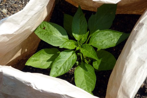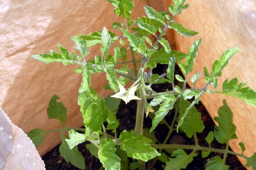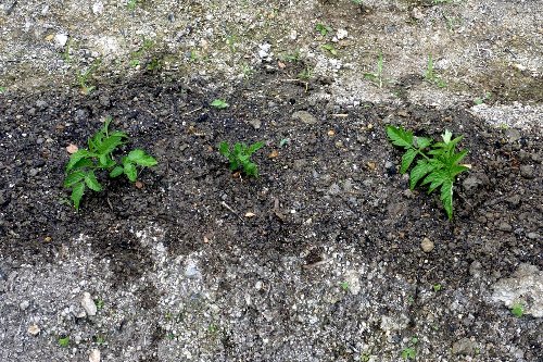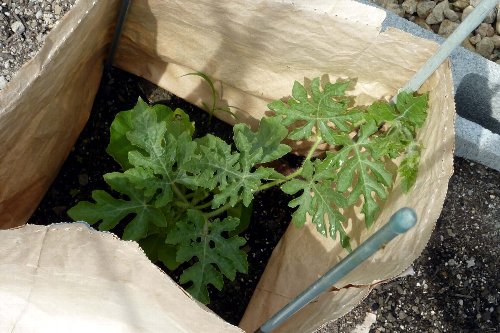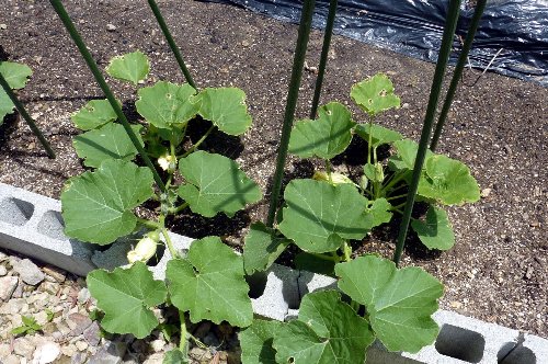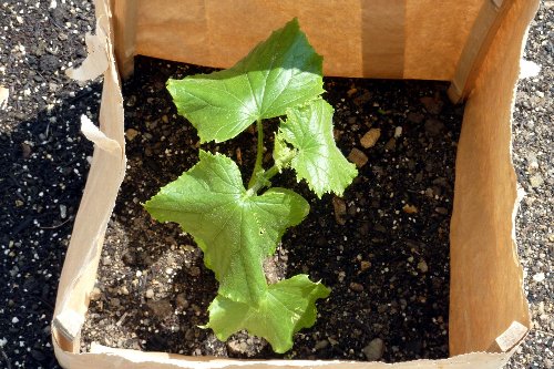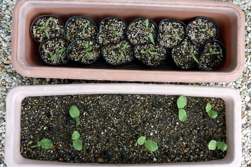 自宅庭プランターに種から植えたカボチャ苗とトマト苗。