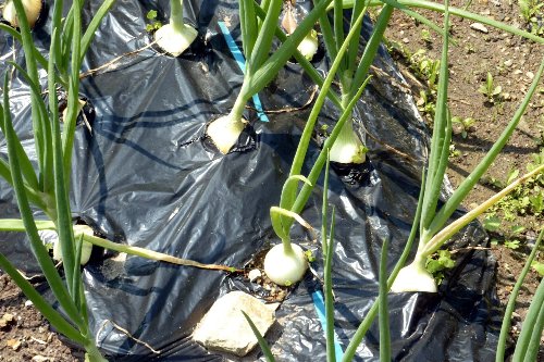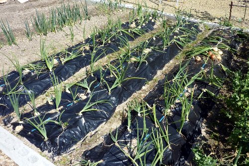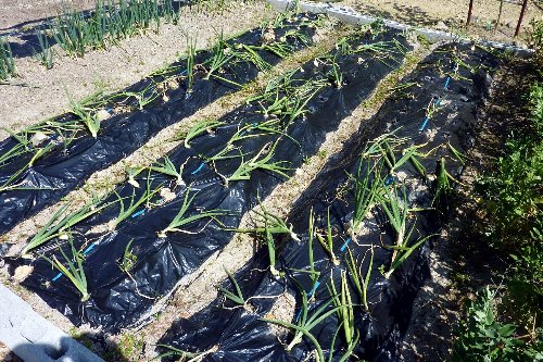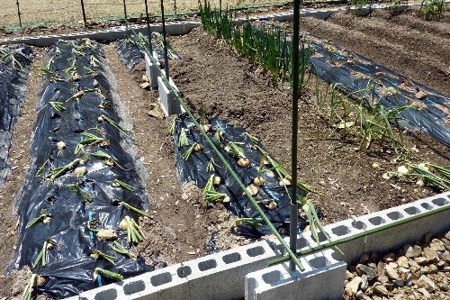 タマネギは殆ど倒れ順次収穫。 先日植えた隼人イモの葉が枯れている。