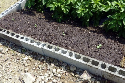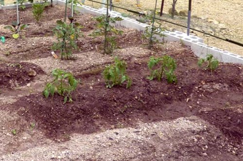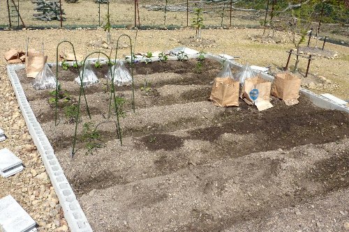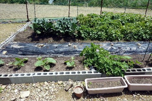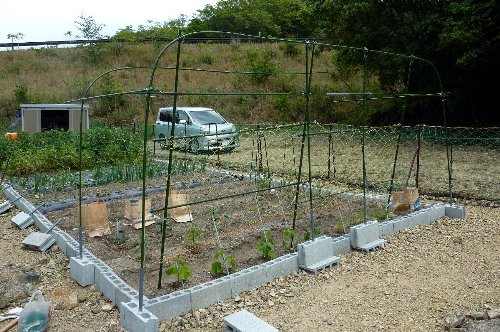 基礎部分はブロックと水道ビニール菅を キュウリとゴーヤ用の網張りも完成。
