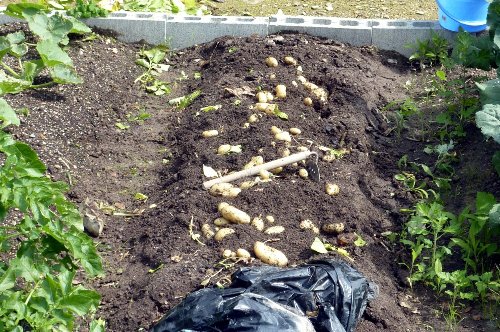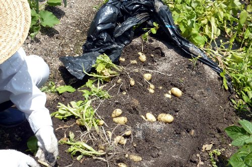 ジャガイモの収穫は大中小ゴロゴロ。 ジャガイモとソラマメをタマネギと