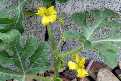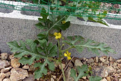 初めてのスイカが伸びだした。 トマトも花が咲いた。