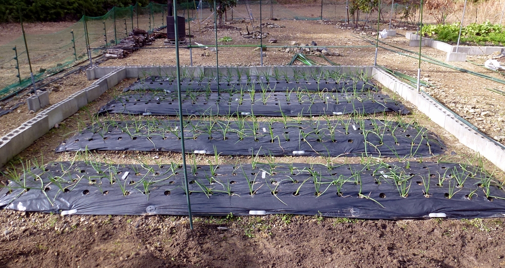 タマネギと豆類に一度目の化成肥料の追肥をし、一ヶ月後に二度目の追肥をする。