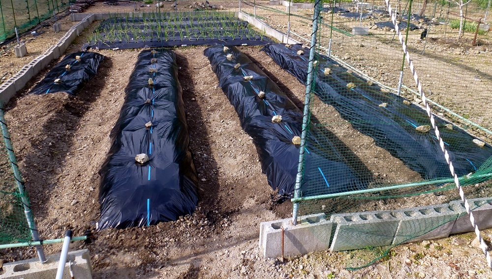 ジャガイモの準備で畝作りから一週間たち種イモの植付けをした。左から