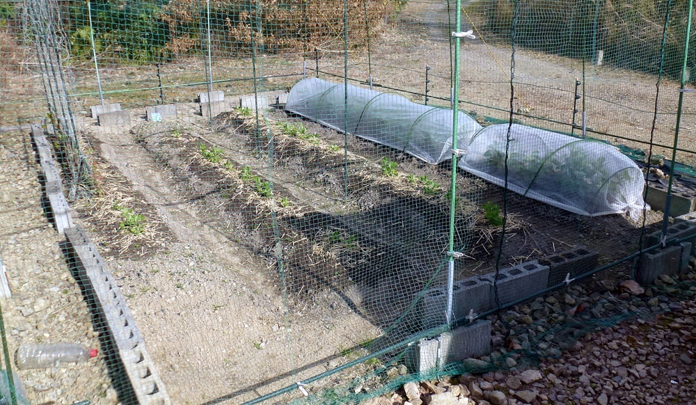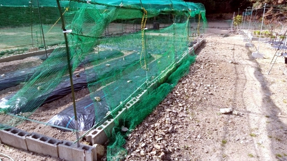 ヘリを土寄せし、上にも重しに石を置き南側だけ風除けに網を下ろした。 .