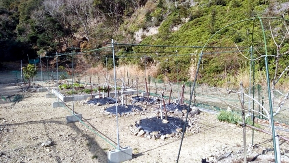 去年10月の台風被害で倒壊したイチジク囲いの網掛けを修復するため