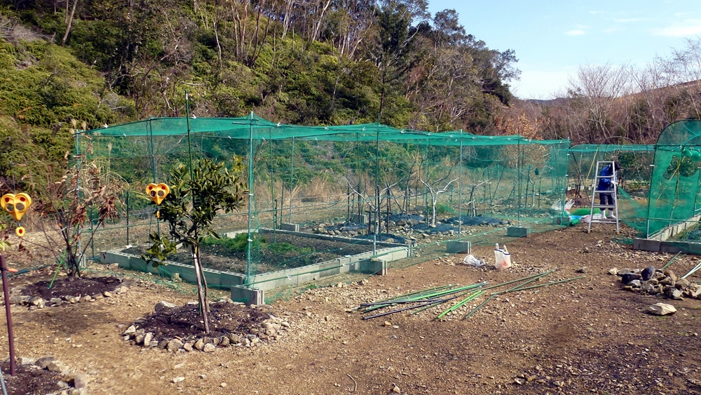 三ヶ月ぶりに台風で潰れたイチジク等の網掛け完成。寸詰まりだった北側を
