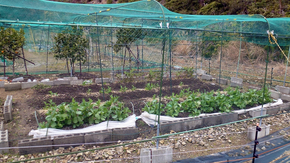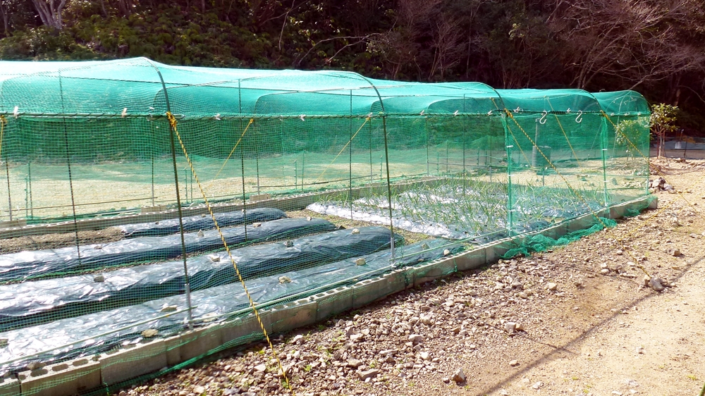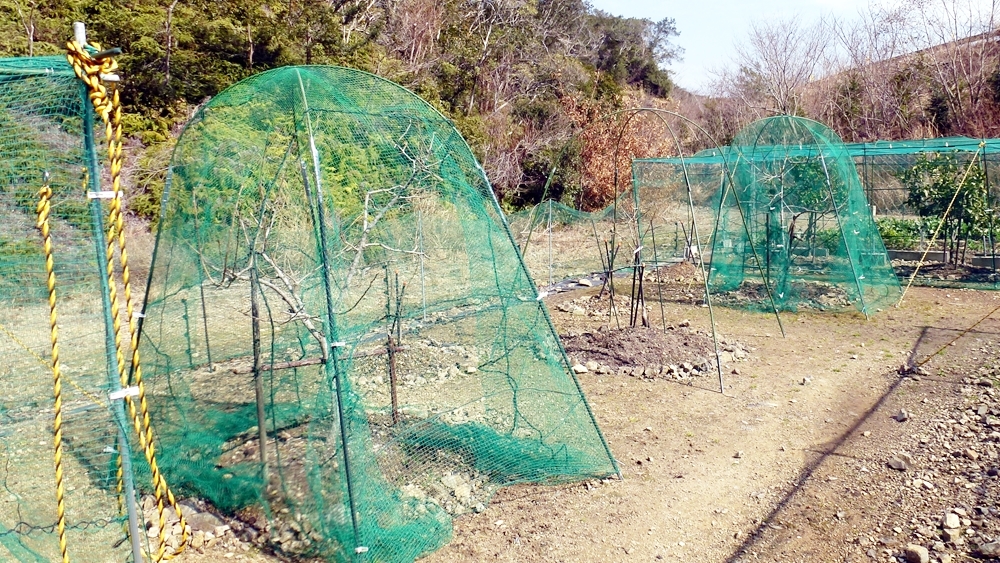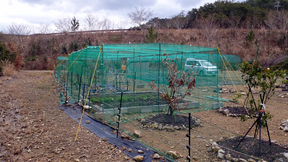 1mの網で覆い一部下部は止めないで、強風時ははためくにしておいた。 .