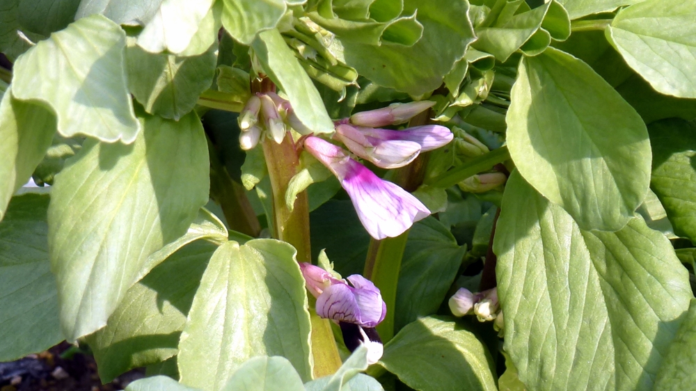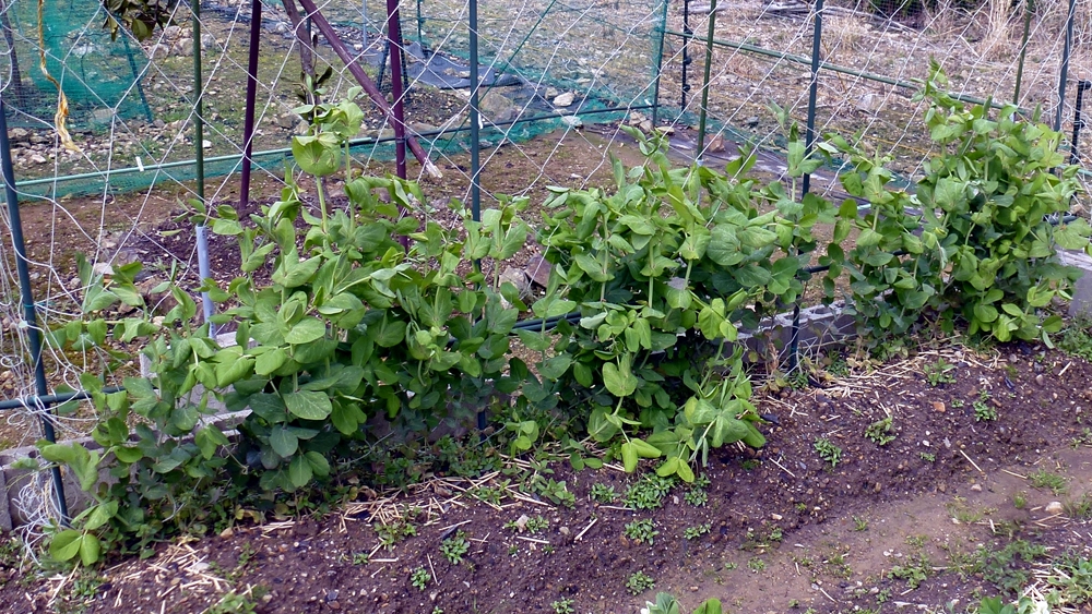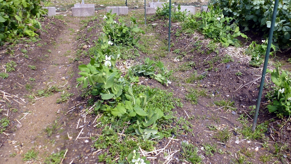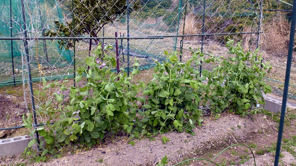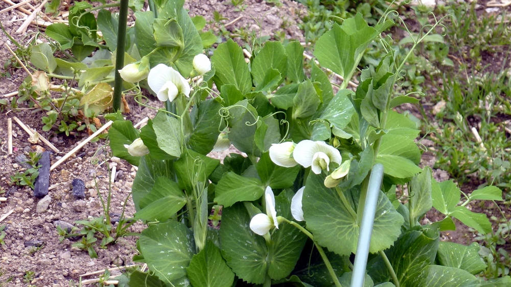 ツル有エンドウのツタンカーメンにも花が咲きだしたが他所の畑ではもう