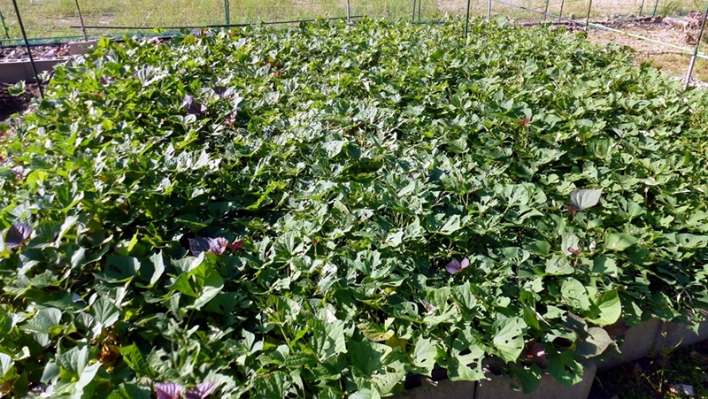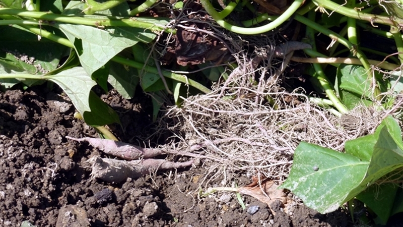 サツマイモの茎が横に広がり茂り根付いていたので引っこ抜いて