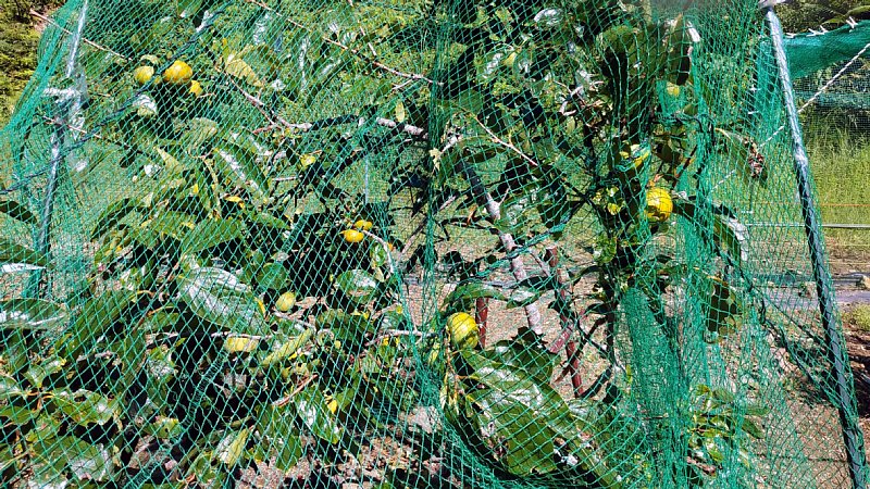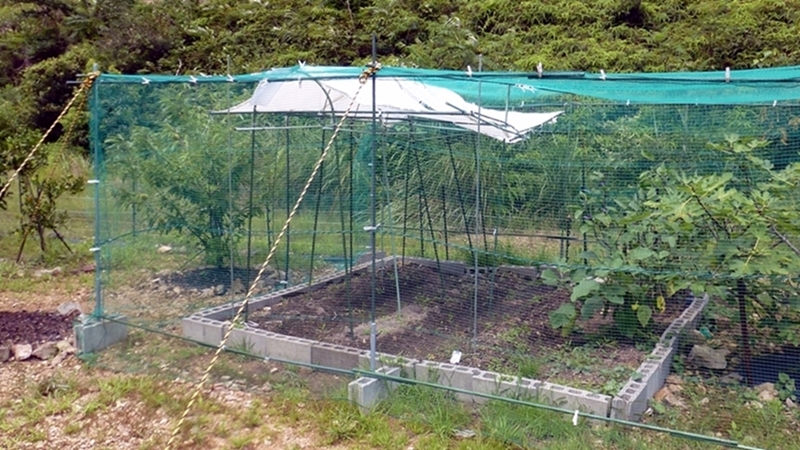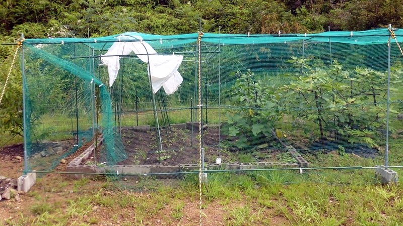 夏野菜とイチジクにかけてある網が台風の強風の影響を受けると