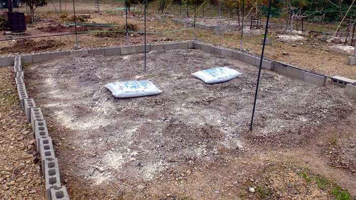 サツマイモと夏野菜のあとに苦土石灰をまき、この後牛糞を購入して