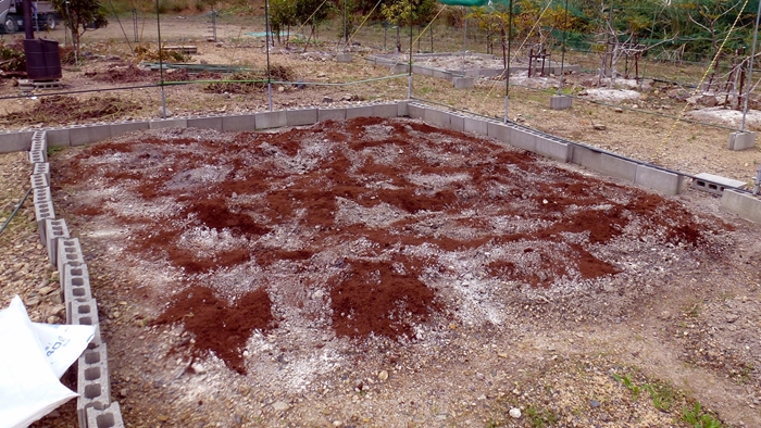 ためにサツマイモのあとを先に捲いていた苦土石灰につづき、牛糞