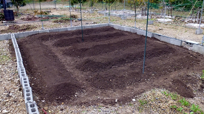 二袋を入れてから耕運機をかけ西と南側をL形に畝をつくりエンド