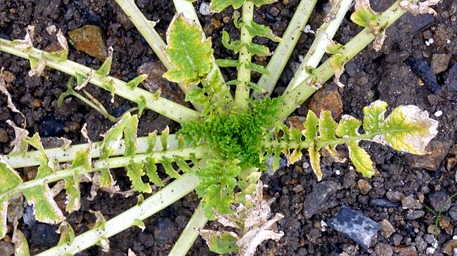 虫に食われたダイコンの三分の一ほどは葉が完全に黄色くなっていて