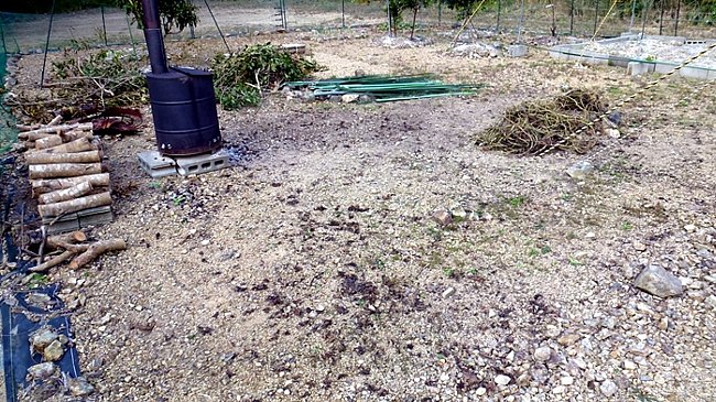 を並べ焼却機の後ろに積み上げ乾燥させることにした。切断に草刈機、トリマー