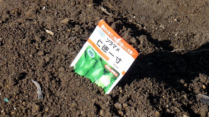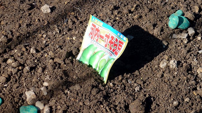 前回種蒔きしたエンドウとソラマメの芽はまだ出ていない。