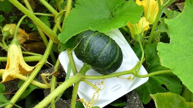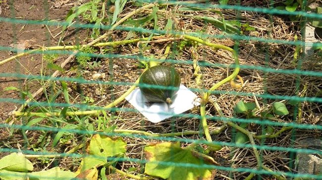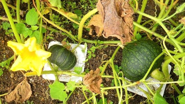 坊ちゃんカボチャと栗カボチャの苗を2本ずつ植付け、それぞれ3個ずつ収穫し