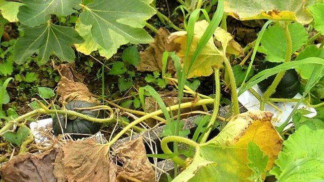 カボチャは苗を植え付けた元の部分が枯れだしたため、葉とツルを
