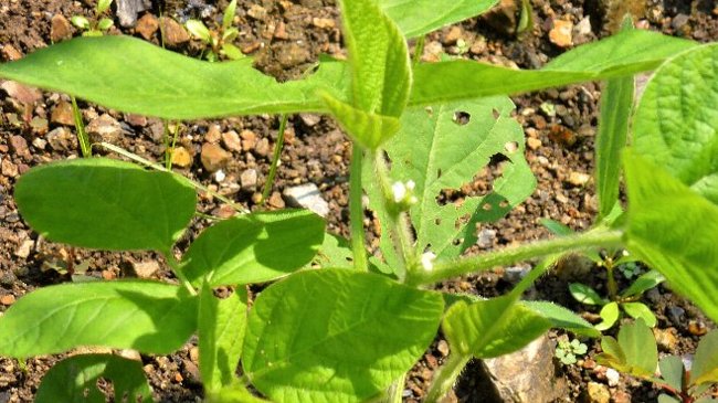 エダマメはよく見ると種を蒔いたのに1/4は出ていない。葉に虫の穴が