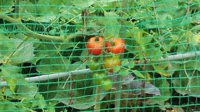 トマトの雨水除けカバーの横骨がまたズレてきて、まだ採れるので