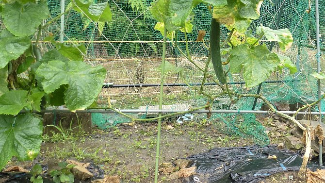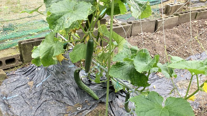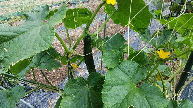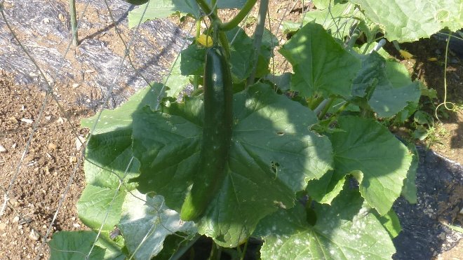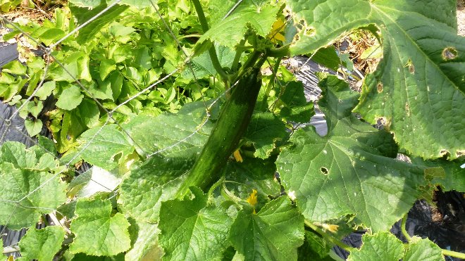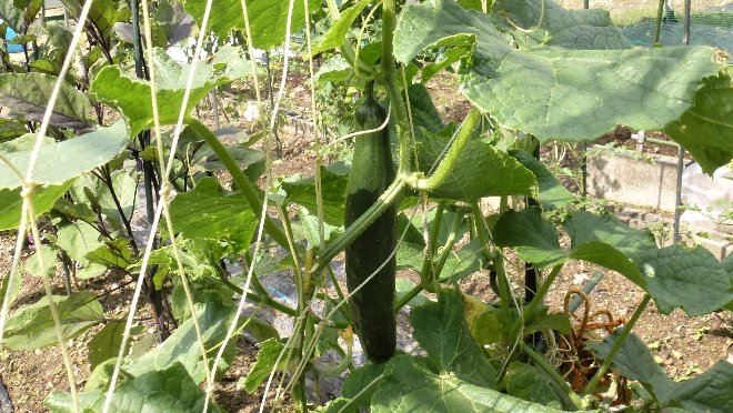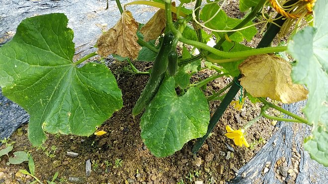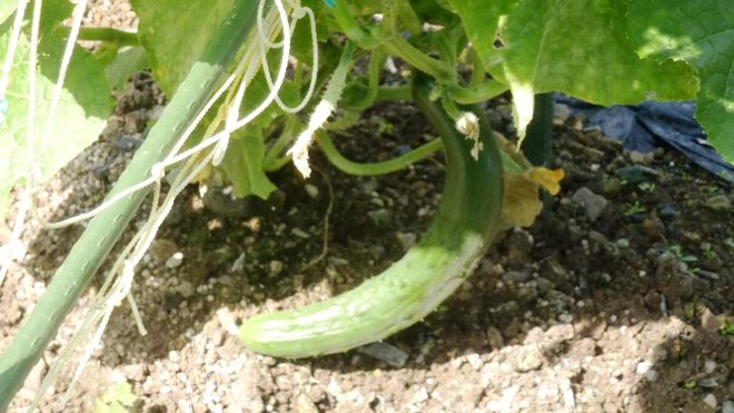 キュウリが二日たち取りごろになってきたが、地面に絡んでいるとどう