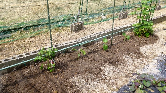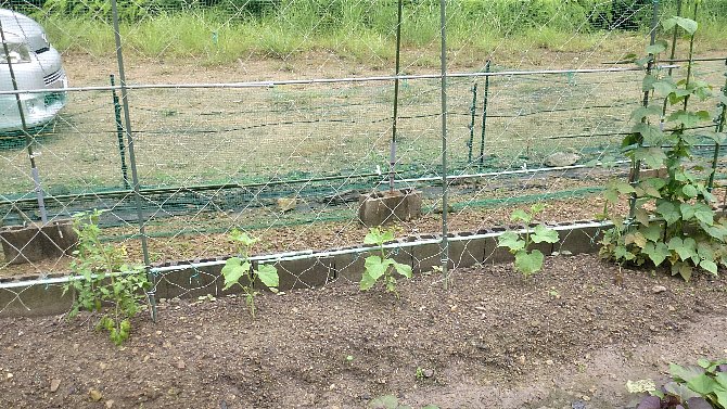 スナックエンドウを撤去したあとが空いたのでキュウリを追加して植え付け、
