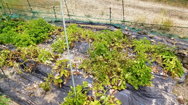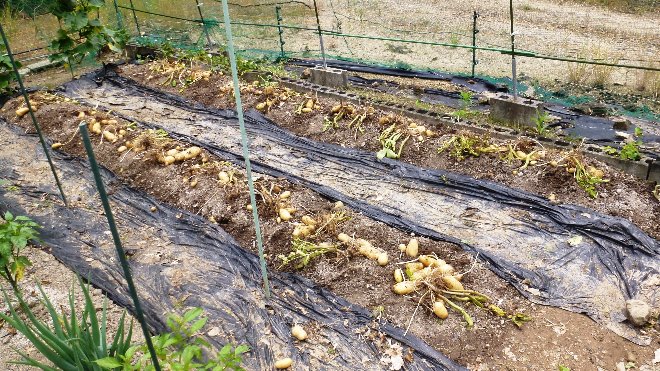 ジャガイモ(メークイン)の葉が枯れだしたため収穫することにし、マルチ