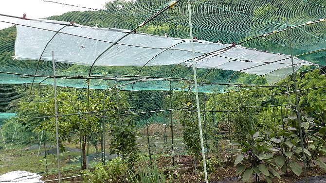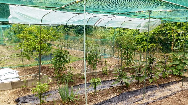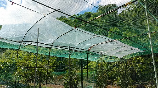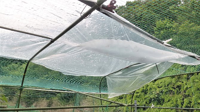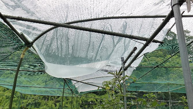 トマトの雨水除けカバーを網掛け骨組みと網のあいだにビニールカバーを