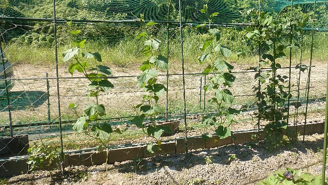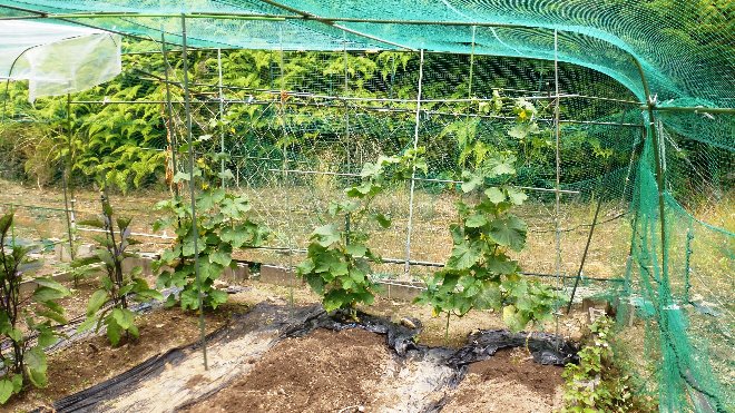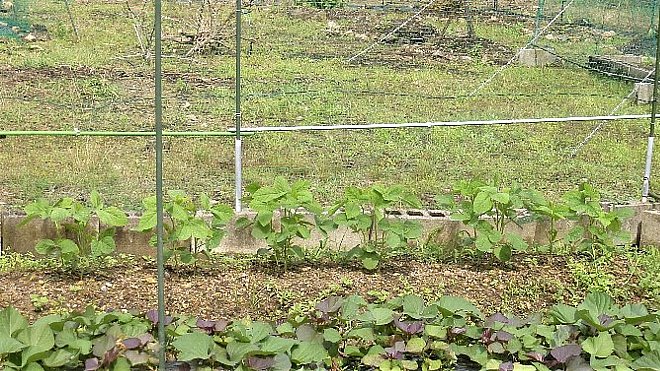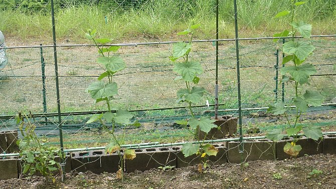 あとから植え付けたキュウリの苗3本が伸びだしたので、今年は長く